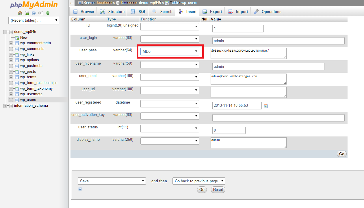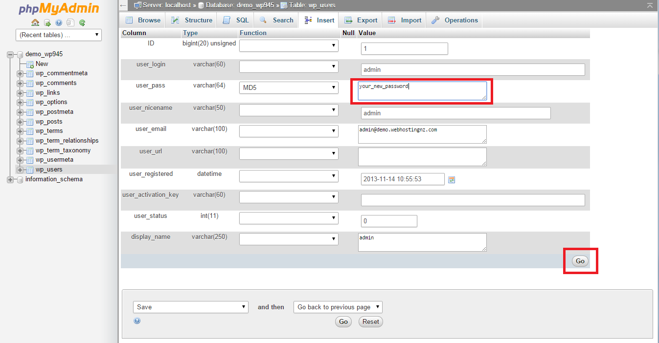 6) Remove anything in the user_pass line under value (it's the MD5 version of the previous password). Type in your secure password and click Go.