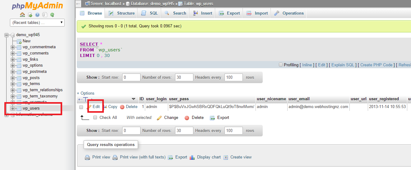 4) On the left hand side click wp_users, then click the Edit for the admin/user you wish to update the password for as shown in the picture.